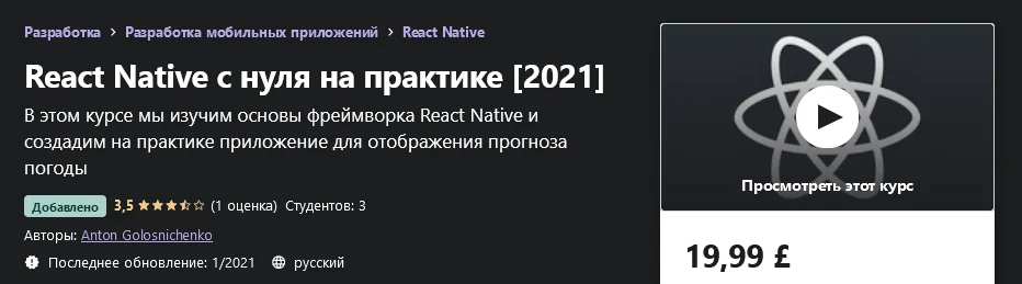 В этом курсе мы познакомимся с основами фреймворка и сделаем на практике наше первое кроссплатформенное мобильное приложение (под iOs и Android) используя всю мощь фреймворков React Native и Expo.