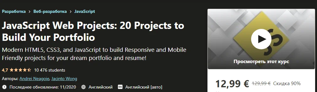Если вы хотите стать фрилансером, получить работу или просто продвинуться по карьерной лестнице, этот новый курс шаг за шагом проведет вас через 20 проектов JavaScript, которые вы сможете настроить и сразу же добавить в свое портфолио. Попутно вы научитесь создавать проекты с использованием HTML, CSS и JavaScript и по-настоящему получите навыки разработчика JavaScript.