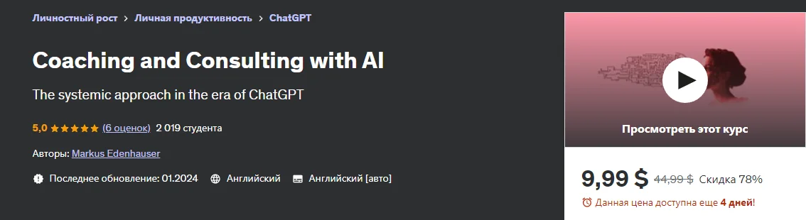 Курс также знакомит меня с вариантами использования ChatGPT Plus и других инструментов искусственного интеллекта, которые поднимут мою коучинговую и консалтинговую практику на новый уровень.