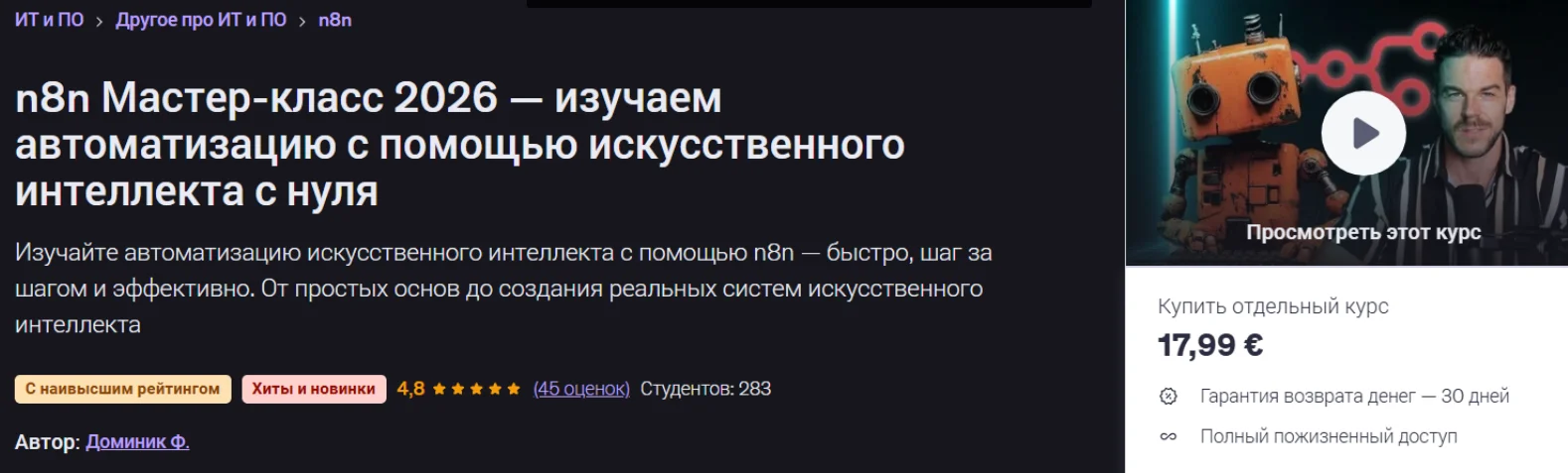 - Курс предназначен для новичков, которые хотят получить структурированное и понятное введение в n8n и автоматизацию с помощью искусственного интеллекта.