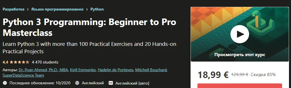 Этот мастер-класс предоставляет вам все необходимое, от основ Python до методов, используемых профессионалами, для начала создания и применения Python.