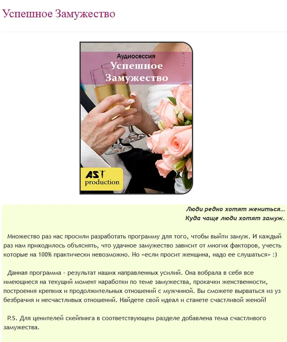 Программы самого последнего поколения 2018 года воздействуют на подсознание слушателя на всех 4-х уровнях: на уровне мыслей, убеждений, генетической памяти и на уровне души. Последний уровень был наиболее сложной задачей, но мы знали, что именно он позволяет вызывать глубинные изменения, приводящие к переменам как в сознании слушателя, так и в его физическом теле. Взаимодействуя с подсознанием на тета-волне, сессии данного раздела эффективно меняют образ мышления, подготавливая вас к проживанию жизни на качественно новом, недостижимом до этого момента уровне.