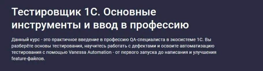 Курс не требует опыта в тестировании и подойдёт как для первого знакомства с QA, так и для осознанного старта в профессии тестировщика 1С.