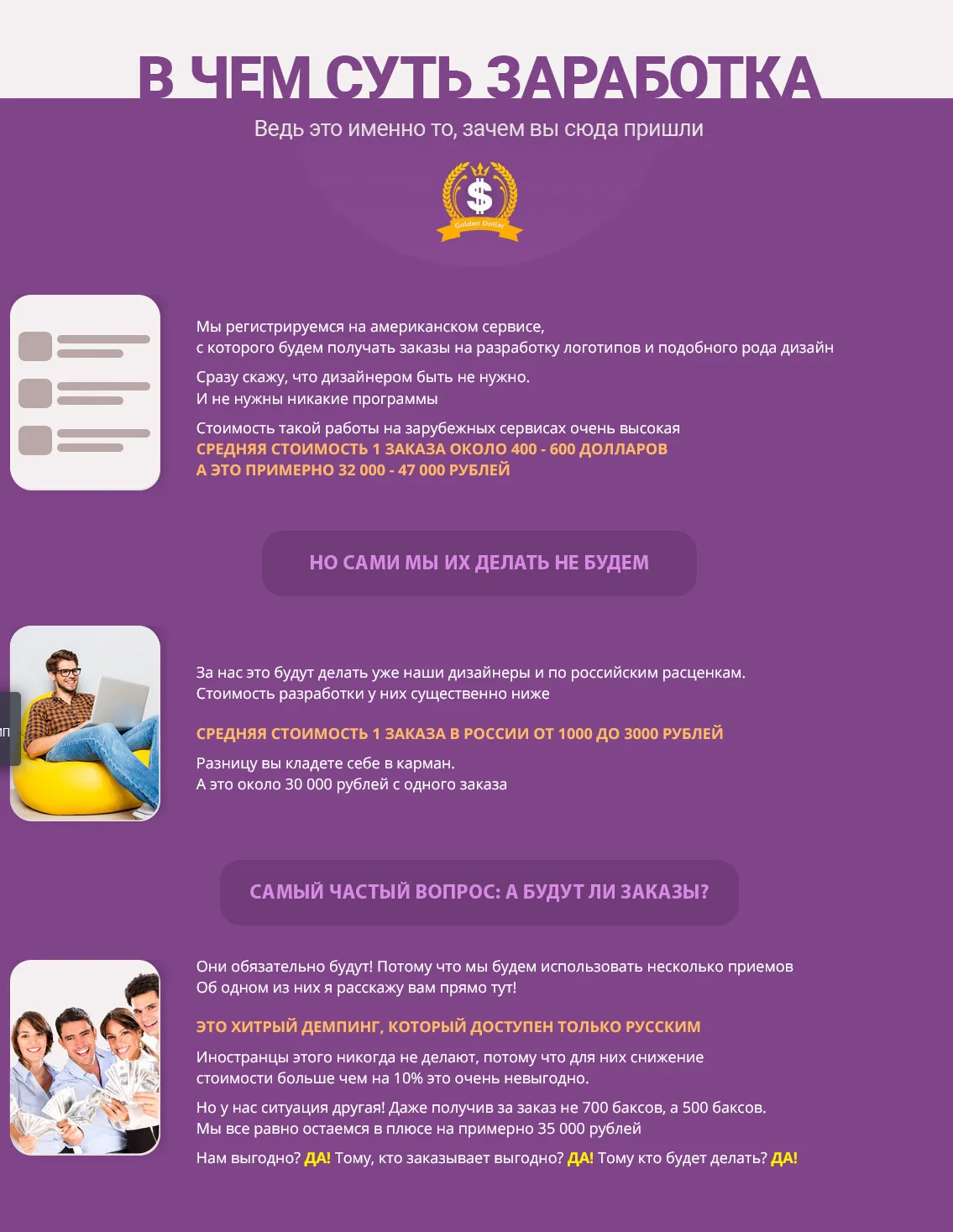 В общем, автор курса предлагает работать на американской площадке фриланса. суть в том что за ту работу , которую выполняешь там, платят больше , чем на русских площадках, оно и логично. А конкретнее, создавать логотипы, визитки и тп. сделав все по инструкции, я направила своё резюме (приукрасила, что-то добавила своё, в общем завидный работник) на многие объявления, их можно отправлять ограниченное количество, но бывает такое что тебе могут дать в подарок еще несколько коннектов (это типа баллы, за которые вы можете брать работу), но потом их надо покупать. Автор курса сообщает, что заказы мы будем отдавать на наш сайт kwork, то есть искать там человека кто сделает эту работу за меньшую сумму, чем предлагаю нам на американской площадке, то есть выступаем как посредник, если говорить простым языком. Мне повезло, я помимо того что умею рисовать логотипы визитки, я являюсь переводчиком с высоким уровнем английского. Это, естественно, я тоже указала в своей анкете. Отправив, около 20-ти откликов на объявления, мне ответил лишь один человек, и то написал мне свой телеграм) скорее всего чтобы избежать налогов, либо мошенник. Я ему написала, он рассказал о своей компании, естественно о которой я ничего не нашла в интернете, и предложил мне 2200$ за три дня работы, если я ему перепечатаю 220 страниц в word. я попросила хоть какие- то гарантии того, что мне заплатят. но на что работодатель ответил мне: trust me. на том я пожелала ему удачи и всего самого наилучшего!) до сих пор мне так никто и не отозвался. Возможно вы сможете заработать на этом сайте, если вы программист или специалист какого-то узкого направления, или верстаете сайты, таких объявлений очень много. но если вы новичок без рейтинга, еще и иностранец, вряд ли что-то получится.