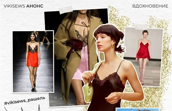 Выкройка платья малого объема, прилегающего силуэта. Платье в бельевом стиле, на тонких регулируемых бретелях. Прилегание по переду достигается за счет нагрудных вытачек, переведенных в боковой шов, и талиевых вытачек. Прилегание по спинке достигается за счет талиевых вытачек. На переде с правой стороны разрез. Верхние срезы спинки и проймы переда обработаны косой бейкой, переходящей в бретель с пряжкой-регулятором. На переде фигурные кружевные вставки по разрезу, верхнему и нижнему срезу; на спинке – по нижнему срезу. Застежка на потайную молнию в среднем шве спинки. Длина изделия выше колен.