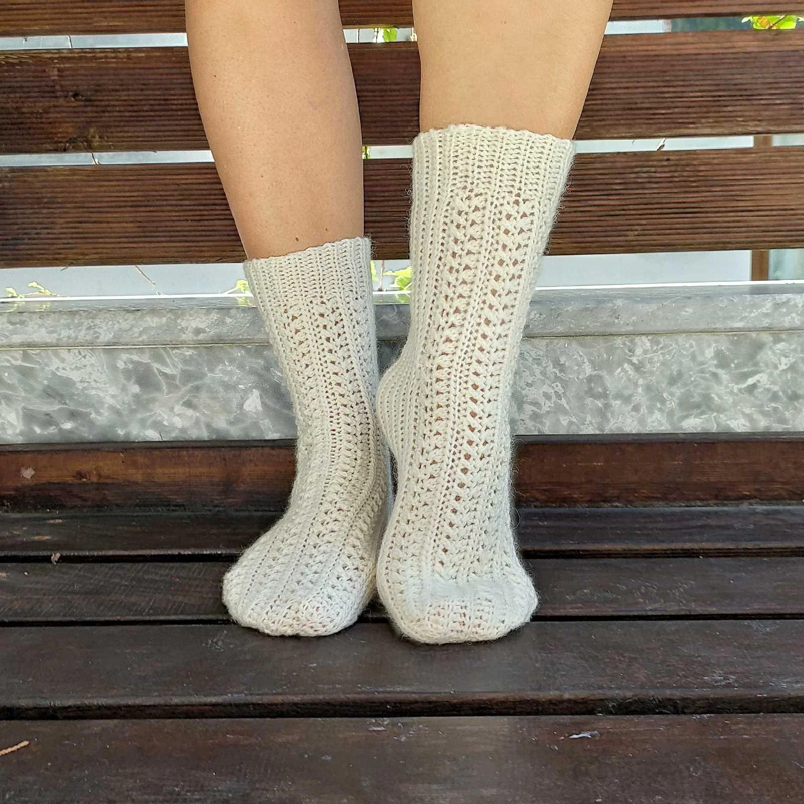 Носочки вяжутся в технике поперечного вязания обратно-поворотными рядами. Сначала вяжется верхняя часть, затем подошва с пяткой. Сложность заключается в том, что ажурный узор состоит из столбиков разной высоты, поэтому общее количество рядов сверху и на стопе совпадать не будут. После того, как носки связаны, следует сшить их трикотажным швом по боковой линии.