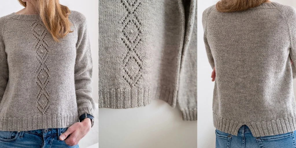 Пуловер реглан с широкими рукавами, связанный спицами сверху вниз.