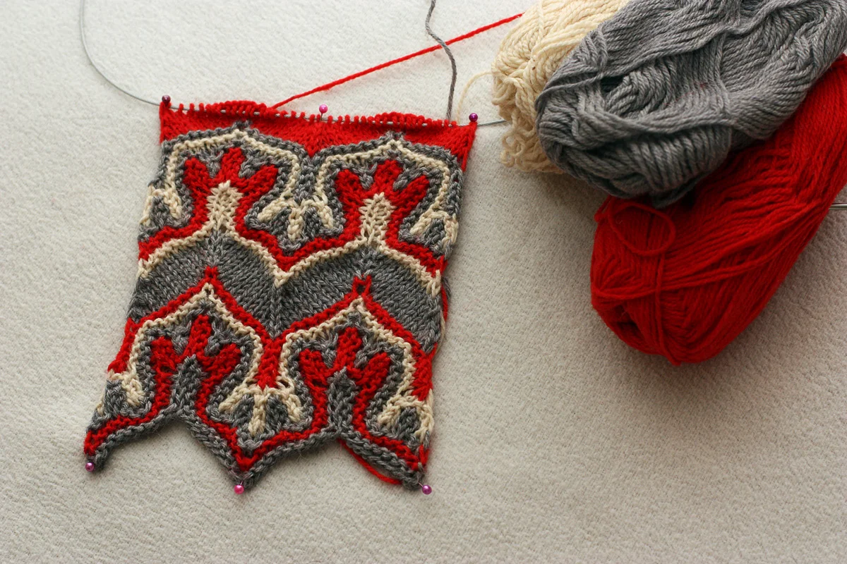 Этот узор можно связать из двух и более цветов без каких-либо протяжек или техники интарсия.