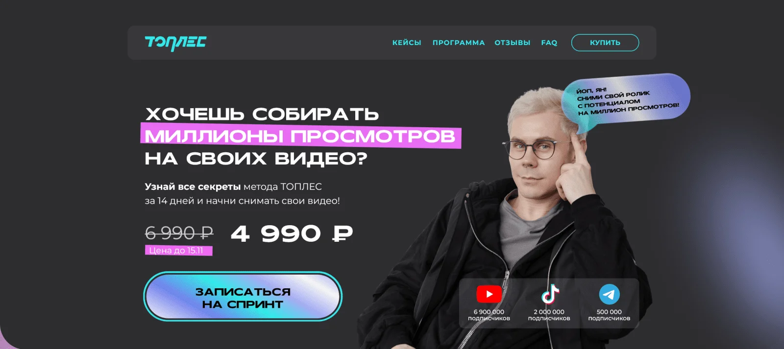 Хочешь собирать миллионы просмотров на своих видео? Узнай все секреты метода Топлес за 14 дней и начни снимать свои видео!