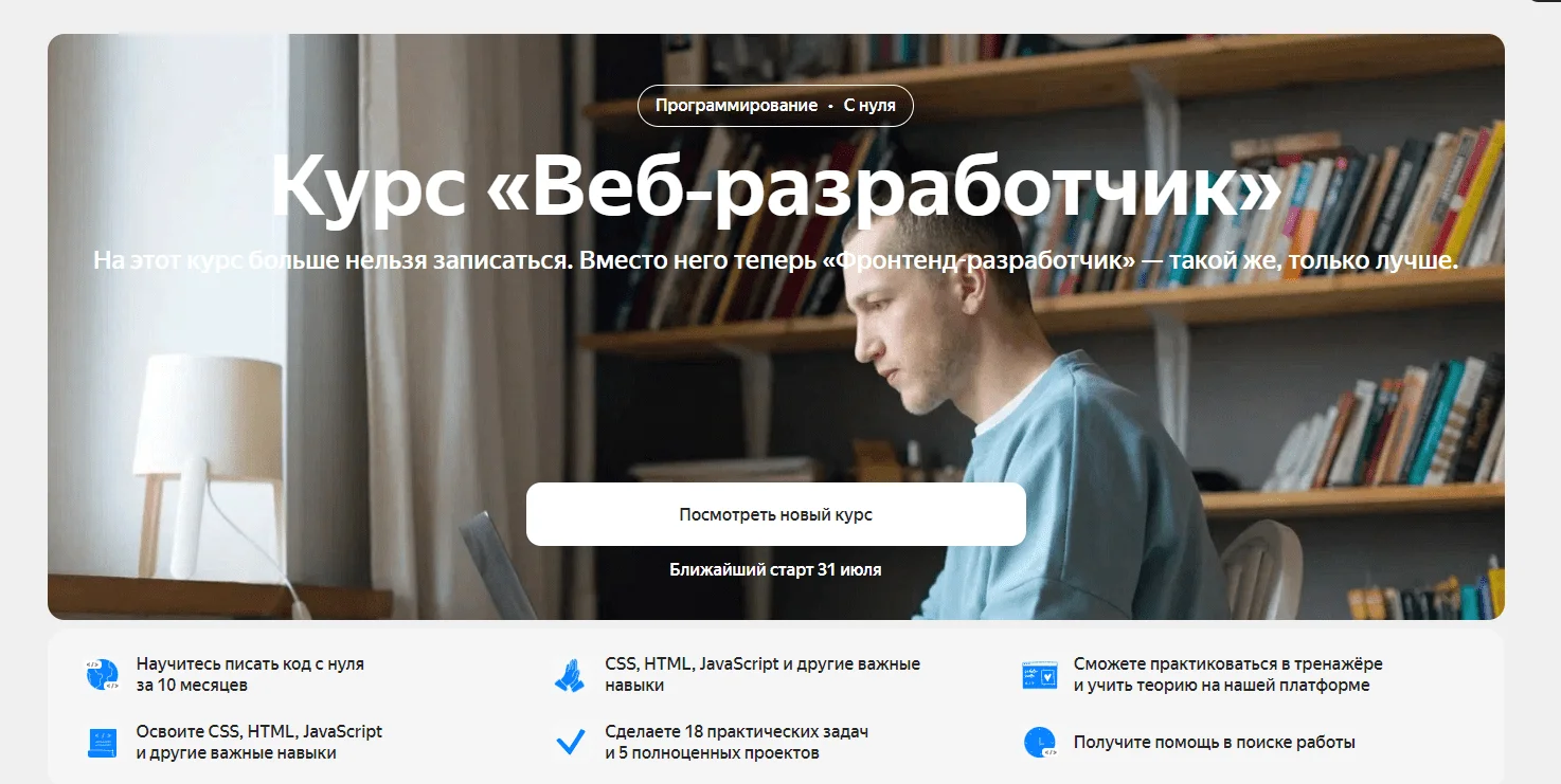 На курсе будут сеансы парного программирования, лайвкодинг и хакатон. Создадите 10+ проектов для портфолио и получите обратную связь от экспертов Яндекса. Чтобы начать учиться, перейдите на страницу обновлённого курса.