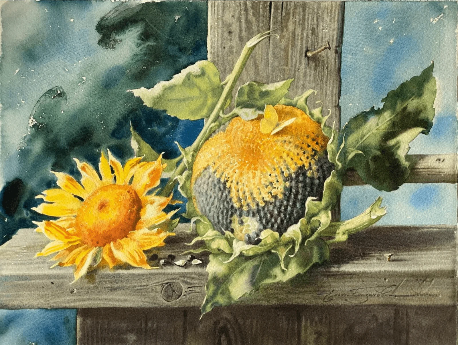 Пошаговый мастер-класс по акварельной живописи натюрморта с подсолнухами.