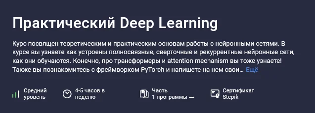 Также вы познакомитесь с фреймворком PyTorch и напишете на нем свои первые нейронные сети.