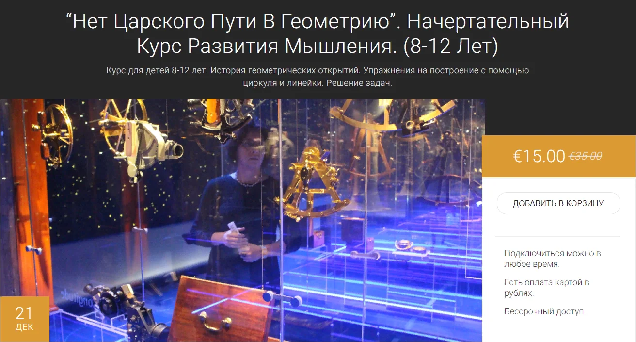 Курс для детей 8-12 лет. История геометрических открытий. Упражнения на построение с помощью циркуля и линейки. Решение задач.